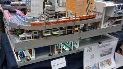 「大阪キタ・ミナミ」と題されたこのレイアウト、何段にも重なったボードに環状線や地下鉄、私鉄ターミナルもそれらしい雰囲気で再現されるコンパクトなBトレレイアウトです。