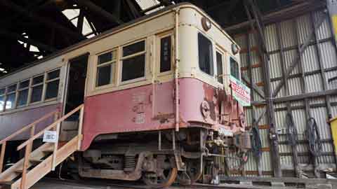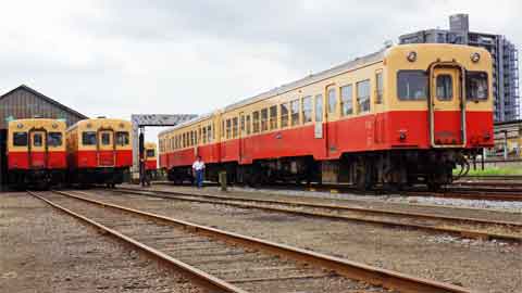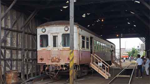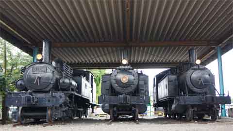 蒸気機関車が保存された屋根の下では前照灯を点けた3両が並んでいます。