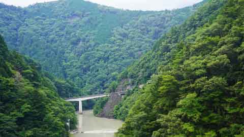長島ダム駅の横を通りトンネルを抜けた所で鋭角に右カーブして下り坂。