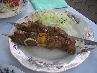 手前左はナンと呼ばれるパン。 手前右はどこでもよく出てくるトマトとキュウリと玉ねぎのサラダ。必ずディル(ハーブの一種)で味付けされている。 |