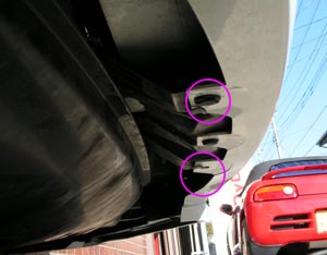 | まずは、バンパー下中央部の3つある内の左右クリップを外します。 |