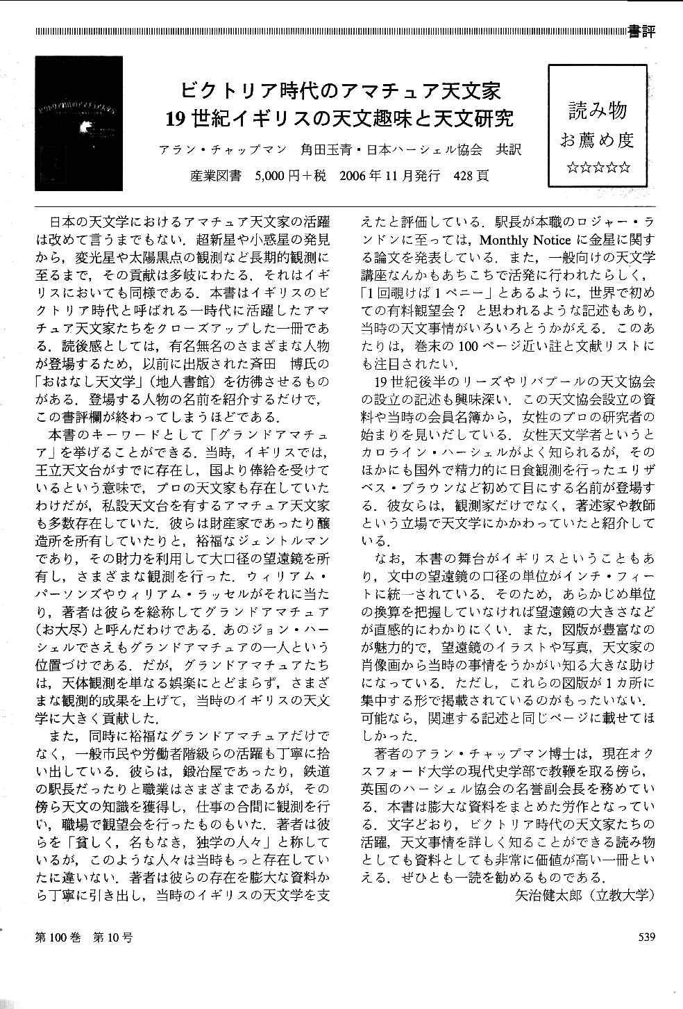 著者のアラン・チャップマン博士は、現在オックスフォード大学の現代史学部で教鞭を取る傍ら、英国のハーシェル協会の名誉副会長も務めている。本書は膨大な資料をまとめた労作となっている。文字どおり、ビクトリア時代の天文家たちの活躍、天文事情を詳しく知ることができる読み物としても資料としても非常に価値が高い一冊といえる。ぜひとも一読を勧めるものである。 」