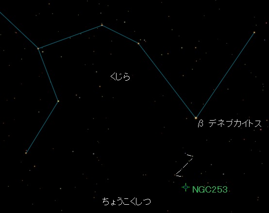 ちょうこくしつ座はぜんぜん有名でない星座です。むしろ、NGC253のおかげで多少なりとも知られているといえるかもしれません。しかし、 NGC253を探すのにちょうこくしつ座を見つける必要はありません。下のガイド図のようにくじら座のしっぽにあたるβ星「デネブカイトス」から探すほうがずっと便利です。デネブカイトスの下に6つの5〜6等星が縦に伸びた Z字型に 並んでいるのをたどると比較的簡単に見つけることができるでしょう。同じ秋空のアンドロメダ銀河には及びませんが、春空の明るい銀河M81、M51、 M104などに匹敵するクラスの見栄えです。南の空がよく晴れた夜に口径6〜10cmくらいの望遠鏡で見てみてください。
