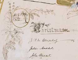 このカードの主題は「家族の旅行−マリアとヘンリー・ハードキャッスルとの結婚のために蒐集。赤ちゃんはマーガレット・ハーシェル。 描き手はマチルダ・ローズ」です。図柄は簡単には説明できないほど複雑で、ここではそのごく一部分−左中央部をお目にかけます。サインは クリスマスのほうで、10人中トップの3人(J. F. W. ハーシェル、ジュリア・ハーシェル、ジョン・スチュワート)のみ読み取れましょう。円内は家族旅行をした南国のようです。