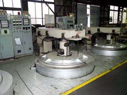帰国後、富山県高岡市の銅合金地金の専門家の野寺勝弘氏へ次の金属鏡の鋳造の御願いをいたしました。野寺氏は、'03年度の瑞宝単光章受賞者の金谷清氏をはじめとした3人の優秀な技術者集団へ依頼をして3月30日に主鏡用2面と平面鏡用5面の材料を鋳造してくださいました(写真7参照)。錫30%のように錫が多い銅合金の鋳造は初めてということでしたが、鋳造当日は、銅鋳物の産地高岡市の誇りにかけてという意気込みで鋳造所内は緊張感が張りつめていました。