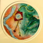 ハーシェルとの出会いによるこの特別な作品は1998年の作。ハーシェル兄妹の肖像をテーマに描いた一連のものです。カロラインが橙色のバックに星座や天体や望遠鏡に囲まれて描かれ、ウィリアムの方は紺色の宇宙に彼の肖像と天王星と大望遠鏡や星々を描いています。日本国内や英国バース、スラウ展など主な展覧会に出品してきました。この席で、ウィリアム・ハーシェル協会から同博物館に貢献されたヒューズ教授ご夫妻に贈られました。私は記念すべきこの機会に、ご夫妻とお会いできたのをたいへん喜ばしく思います。