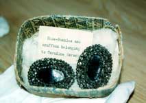 ショーランド氏のアーカイヴズに保管されているハーシェル家の数々の遺品の中から、昨年も拝見させていただいたカロライン・ハーシェルの「靴のバックル」を特に選んで、明るい2階の部屋で見せていただきました。昨年(2001年10月)のニューズレター第109号7ページには、大ぶりのラピスラズリとご報告いたしましたが、それは1階の暗い部屋で拝見したものでしたので、そのように見えてしまったものでした。詳細に観察させていただきますと、ラピスラズリではなく、濃紺の皮製のバックルで、周囲に大きなマーカサイトが三重にとり囲んでいるもので見事さには変わりがありません。そのような事情ですので昨年の記事を訂正させていただきます。また、どういう理由なのかこのバックルが保管されている小箱の中に、カロライン・ハーシェルの遺髪もいっしょに納められています。