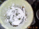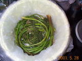 | 戻すときは、食べる分だけ取り出し、できれば銅鍋に水を張り、火にかける。沸騰して緑色が戻ってきたら火を止める。水を換えながら好みの塩加減まで塩を抜く(数日) | あとはきんぴらなど調理して食べる。汁や炒め物の具にしてもよい。生とちがってまたこれもうまいのである。完全に塩を抜いてから味付けしたほうがよい。太いところの皮はスジっぽくなるので、細かくきざんで炒めるか皮をむいて使う。小ぶりのものを塩漬けにまわすのがよいだろう | ||||||||||||||||||||