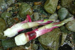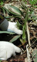 | 根元を少し掘り、地下茎の上でナイフで切るとよい 両手を使えないときは、フンっと折る(難) たくさん取れる場合、根元にこだわらずに地上部だけ採ってもおいしくいただける 太くてやわらかいものがよく、1mだと大きすぎるが、ものによるし、上のほうだけ食べることもできる 栽培ウドは全て収穫後、上に盛り上がってきた地下茎を「切り下げる」のだが、問題なくあらためて発芽して成長し、翌年また元気に出てくる。ということで、ウドに関しては採りすぎとか地下茎を傷つけるとかはあまり気にしなくてもよさそうである。 |