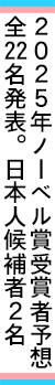 2025ノーベル賞受賞者予想 英国の学術情報サービス会社が有力視される22人を発表した。日本から国立循環器病研究センター元研究所長寒川氏と久留米大学名誉教授児島氏を選んでいる |
