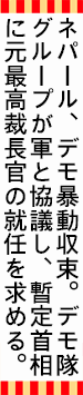ネパールで若者を中心とした過激なデモ暴動が起きた。天安門事件の様な軍による市民の大量虐殺に繋がらなかったのは幸いだ。 |