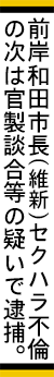 元維新、前岸和田市長逮捕 前市長は女性問題で解決金5百万円を払ったが市長には復帰できず、秘密の筈の官製談合等の疑いで逮捕。泣きっ面に蜂余罪も追及。天網恢恢疎にして漏らさず |