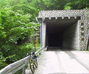 途中で曲がっていて真っ暗のトンネル、ライトをつけても水平感覚がなくなり怖い、 僕は乗ってられずに降りて押しました、中は岩剥き出しで長さは200mくらい。