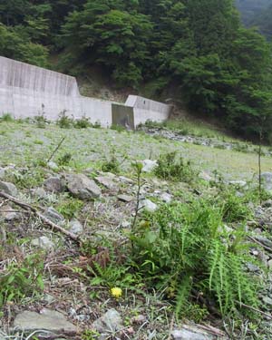 広い河原に横広の大型砂防ダム、がれ場に咲く花も多い、(蛇も多い)