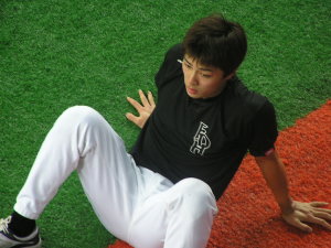 | 確かに男前、和田投手 | ボールを使ってトレーニング中 |