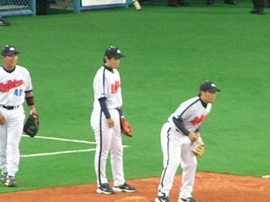 | 何故かカメラ目線(?)岡本投手 | 憲史・吉岡・北川がファーストの練習 |