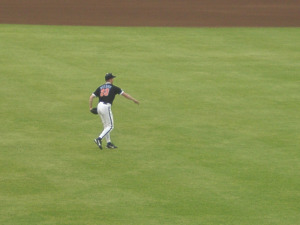 | この日の先発バーン投手。 もう試合直前というのに、 なぜか外野でキャッチボール中(笑) |