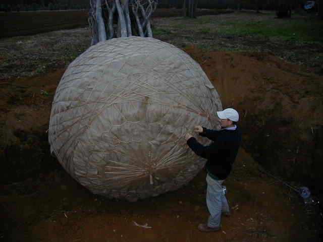 In Japanese style wrapping the materials are adaptable because they can be used to bind the rootballs of both large and small trees. When the trees are planted the wrapping can be left on to rot in the ground. The materials are also nice to work with and root-ball wrapping can be made to look artistic for garden trees.