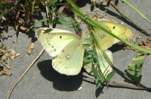| 左からモンキチョウ♀、ツマキチョウ♂、モンキチョウ♂。 やはり似た色同士が追いかけあいます。 |