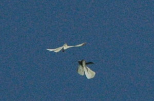| 帰りに白い芝桜にモンシロチョウが何度もアタックしているように見えましたが、花には♀が居ました。 その後、空高く舞い上がっていきましたが、既に拒否行動をしているようでもあり・・・。 |