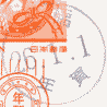 右は日本郵便「DMファクトリー」のオリジナル年賀はがき作成サービスを利用されたオリジナル年賀はがき。これはくじ番号の間にもオリジナル図案が入ります。 熱田の七里の渡し跡に合わせて、熱田局の年賀印です。 |