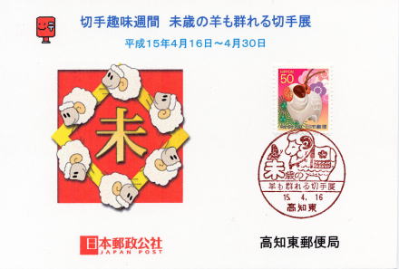 2003.4.16〜30 JPS高知支部 主催 於 高知東郵便局 毎年切手趣味週間に開催される、干支に因んだテーマによる切手展です。 題名を考えるのも大変のようですが・・・(^_^.) 初めは「ひつじどしの ひつじがむらがる きっててん」だったのですが、「ひつじもむれる」なら7文字で収まるので変えていただきました。 「ひつじどしの」とすると6文字で語呂がよくないような気がするのですが・・・(^_^.) 形から言えば「午歳の」と同じ形になるのでこのままになりました。 デザインは、シリーズとして同じ形にするつもりでしたが、ヒツジがのんびり草をはんでいる情景を想像していたら、チョウが飛んできました・・・。(^^ゞ ここは高知ですから、ミカドアゲハにしました。(^.^) 2003.2.16記 |