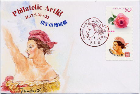 | 美術切手に関連した展示で、パソコン郵趣部会のお仲間、絵画切手部会でもご活躍の中野晶氏と江村清氏の切手展です。 小型印のテーマは「日本におけるフランス年」記念切手、ドラクロワの「民衆を率いる自由の女神」の頭部です。この切手が廃棄処分になった直後にご連絡をいただいたので、友人に分けていただいたり、知人に頼んだりして探しています。(^_^.) なんとか集まりそうかな、と言うところです。 さて、「絵画切手部会展'03」でのボッティチェリのビーナスはイタリア人の顔で難しかったのですが、今回はフランス人。それも頭部だけなのでかなりアップで、しかも横顔。コンピュータ処理で、暗いところは真っ黒に塗りつぶすようなデザインは嫌なのですが、一体どうしたら立体感が出るのか、影が汚れに見えずに済むのか、苦労しました。勢い、石膏デッサンをしているような気になって、なんだか硬く、血が通っていない風になってみたり・・・。何度も描いては、スキャンして縮小印刷、を繰り返しました。 「絵画切手部会展」とつながりを持たせるため、変形印にしました。 女神の被っている帽子は「フリージア帽」と言って、自由の象徴なのだそうです。 わたしの描いた小型印の第50作目になります。 2005.3.16 記 公示が降りました。 2005.4.19記 http://www.post.japanpost.jp/kitte_hagaki/kogata/h17_tokyo_k.html |