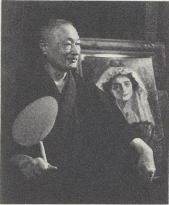 藤島武二の画集に載っていた晩年の写真には、後に「黒扇」の絵が置いてありました。インタビューのときに出してきたものなのか、ずっと手元に置いていたのだろうかといろいろ想像しましたが、彼にとって大切な絵であることは間違いありません。 |