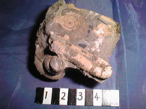 アラキの沢近くの小平蘂川本流で川の中から助け上げた化石です。正常巻きと異常巻きのアンモナイト(ポリプチコセラス)の化石と左下には巻き貝の化石も見えています。河原で見つけるものよりも川の中の方が良い化石が見つかります。