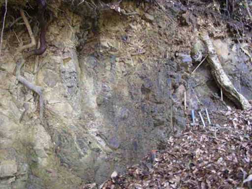 露頭の写真です。壁一面にシダ植物のCladophlebisが見えていますが、密集しすぎて黒くなっており、なかなかいい状態では採集できません。