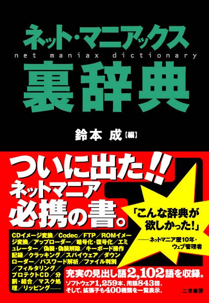 | 宣伝? これは去年末に仕事で多忙で、死にそうになっていた時の事である。 なんと、アウトルックの受信トレイに見慣れない宛て先からのメールがあった。 何事か? と思いメールを開いてみる。 。。。。。 カリカリ・・・。 なんか、いや〜んな・・・ハードディスクのアクセス音。。。 と、私の心配をよそに、ただ単にテキストのメールであった。 なんだろうと思い見てみると。。。 「突然のメール失礼します。」 と出てくる。 普段仕事で忙しく、夜中1時過ぎに帰ってくきて、ビールでも飲みながら、久々ににメール受信してきてみると この、いかにも、宣伝メールっぽい文面である。 たまには、女子高生からの、応援メッセージでも貰いたいなあ。。。等と思いつつ、よんで見る。。。、 、、、、 なんか年末にネットのソフトウェア紹介本を書くので、そこにうちのフリーソフト、載せてくれって言う事らしい。 まあ、どうせ誰も世間ねえだろうなどと思いつつOKメール出して ほおって置いた、、、 で、なんか、その本が発刊する事になったらしい。 まあ、せっかくなので紹介しておく事にしよう。。。 書名 : ネット・マニアックス 裏辞典 編者 : 鈴本成(すずもと あきら) 発売日 : 2003年 5月30日(金) ページ数: 432ページ 定価 : 2,000円(税抜) ISBN : ISBN4-576-03106-6 発行 : 二見書房(http://www.futami.co.jp/) 写真はこちら。 なんか、ネット、マニアックス、裏辞典、などという、 いかにも、そそられるタイトル。 ちなみに、マニアックとか、裏とか、管理人の私とはまったく関係のない言葉連発しているなあと思った。 |