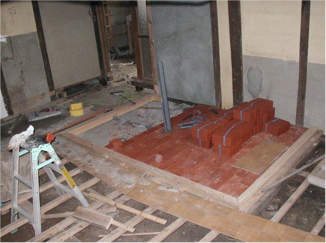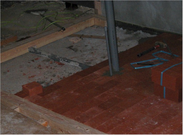 もう少しでできるかな? 土間の煉瓦貼りも1日で終わってのんびりと昼食をと考えていましたが、あさはかでした。セメントの練りもさることながら、排水パイプと水道配管に合わせて煉瓦を加工するのに時間がかかり、おまけに材料不足で購入に時間がかかってしまいました。 都会と違って何か物を買うのにも遠くまで車で移動しなくてはならない。この時間が勿体無いと思うが、これが本来の田舎生活なのでしょうか?これに不便さを感じているようでは、田舎暮らしとしてホームページを開設することは・・・・・・・? 今回で煉瓦を何と152枚も貼りました。 煉瓦貼りを簡単に考えていたことを深く反省しています。以前2日間で貼り終えた煉瓦が水平を保っていませんでした。水準器を使わず感だけを頼りに貼ってしまったためです。今回(3日目)何気なく水平を取ってみると、今までの歪みがはっきりとわかってしまいました。修正はききません。セメントが2週間で完全に固まってしまっていたのです。