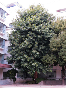 じつは、西宮の兵庫医科大学構内に遙かに大きなインドボダイジュがある。こちらは古く1981年に医学交流を記念してスリランカの大学から寄贈された10本ほどの1本で、植栽後約33年を経た現在、胸高直径約80cm、高さは5階建て校舎の屋上近く16~17mに達していた。