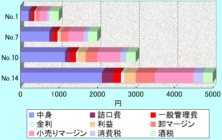 No 小売価格 酒税(*4) 消費税 詰口費(*5) 一般管理費(*6) 金利 利益 中身 流通マージン(*7) 1 1000 253