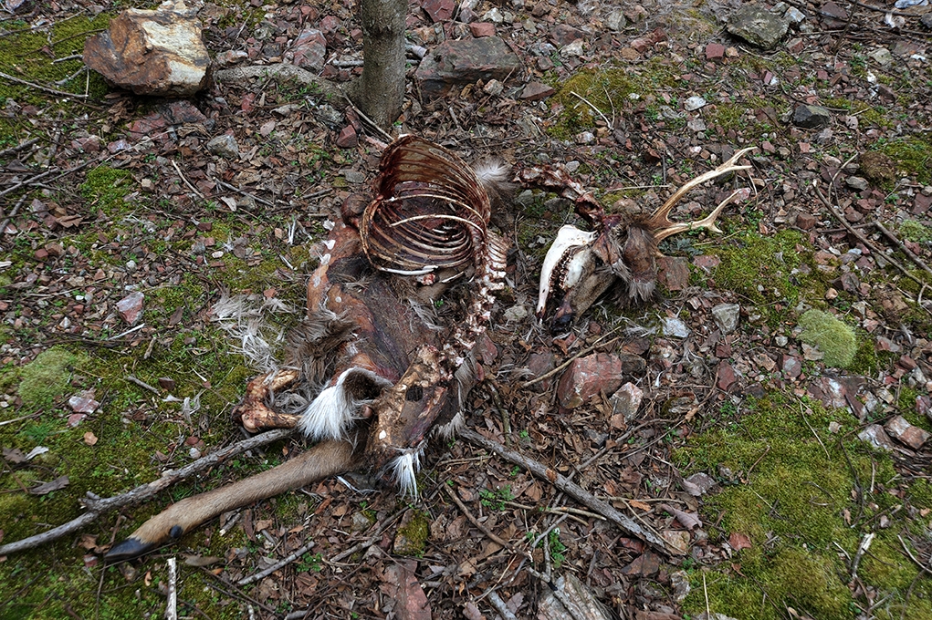 本州の狩猟期間はだいたい11月15日から翌年の2月15日までですが、頭数が増えて林業や農業への被害対策や人への危害予防などの目的で害獣駆除がなされることもあります。確かにこのところの山でイノシシやシカをよく見かけます。昼間からウリ坊を連れて歩いている親イノシシもいますし、山中を歩いているとそこら中で「ピュィー、ピュィー」と鹿の警戒鳴きが聞こえます。数が増えれば駆除されて、減れば絶滅危惧種となって保護されて、人の都合で生きなければならない彼らにとってはずいぶん住みにくい時代ではないでしょうか。雪解けの山で見た小鹿の死骸を見てそんなことを思いました。