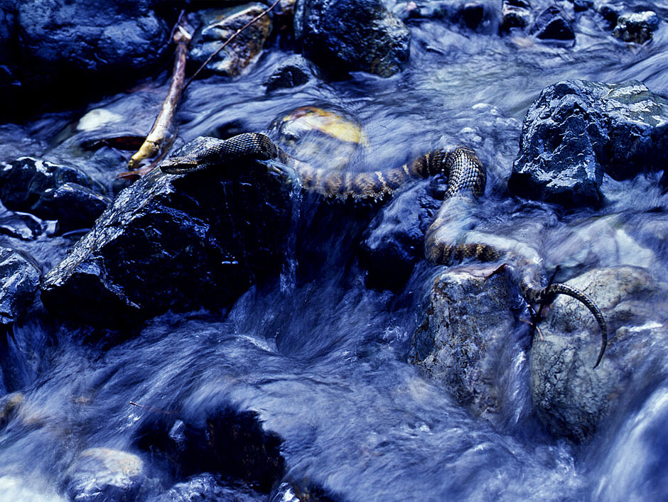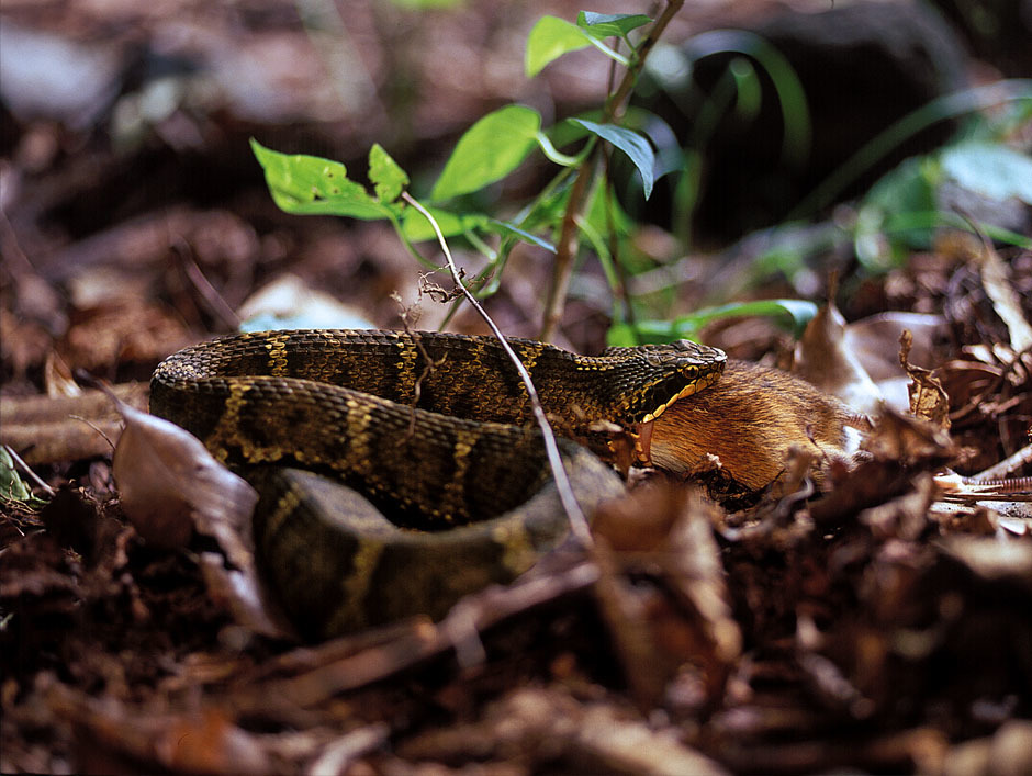 「蝮のような奴」と言えば極悪非道な悪人のイメージですが、実際のマムシは意外なくらい大人しいと思います。こちらからかまったりしなければ何もしないし、こちらに気が付けばすぐに逃げていきます。それにアオダイショウやシマヘビに比べると体も小さくて動きも鈍いです。人里近くにも出没して、田んぼの畦道でお百姓さんに鎌で首をちょん切られたり、捕まってマムシ酒にされたりしています。それでも、咬まれたら大変なので足元に注意をして、見つけても決して捕まえようなどとは考えず避けて通ることです。