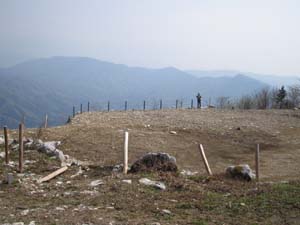 | 標高850mの国見峠(出発点)から登り詰めて国見岳1100m地点に到着。 ここにはKDDI所有地と書いてある標識だらけの、開けた場所だ。 どうやらここに大きなアンテナがあって、それが目印になっているとどの山行記録にも書かれているそうだが、今はどうも撤去されているらしい。 |