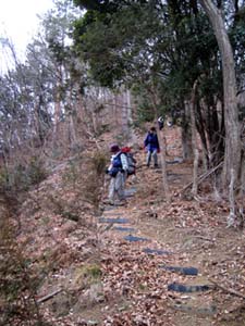 | このあたりでデジカメが黄色信号。バッテリーの容量不足の警告が出ている。どうやらバッテーリーの寿命のようだ。折角記録を沢山残そうと思ったのに大誤算。あわてて最小限にとどめる。 2つめの鉄塔が見えてくる。地形図と比べながら現在位置を推定する。よく見れば稜線との交点あたりで送電線が僅かに角度を変えているので、これが鉄塔を表しているはずだ。 3つ目の鉄塔を目指すあたりで急登となる。落ち葉が深く、意外と手ごわい。 尾根を登らずに左に巻くような踏み跡があり、尾根コースには倒木がちょうど通せんぼしていたのでちょっと悩んだが、ただの倒木に間違いなく(帰りに片付けておいた。)最後の登りを頑張る。 | 「セーメーバン」へ |