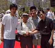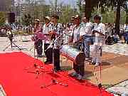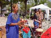 ■ステージ ![]() ![]() ![]() 広島で活動しているブラジル人のカポエラチーム「カポエラ・ ナチーバ」(写真上左)、サンバチーム「SWING LATINO DANCE GROUP」(写真上中)、 サンババンド「セン・ヘボリッソ」(写真上右)に出演してもらいました。平日は 工場などで働き、週末に活動している人たちです。 ブームになっていることもあり、特にカポエラの注目度が高かった ですね。黒人奴隷が「これはダンスだ」と支配者に偽って格闘技を 練習したのが起源で、華麗な回し蹴りや、ふわりと宙に浮く独特の バック宙などに歓声が上がりました。 女の子達のサンバも、手作りのきれいな衣装と華麗な踊りで、 客の目を惹き付けていました。炎天下、3ステージを違う衣装で こなしてくれました。 他に、日本人のボサノババンド(写真下左)と、アフリカンパーカッション グループ「SAYAN」(写真下右)にも特別出演してもらいました。多彩で中味の 濃いステージには、人だかりが絶えることがありませんでした。 ![]() ![]() ■料理 パステウ(ブラジル風ギョーザ)、コシーニャ(ブラジル風コロッケ)、 ポン・ヂ・ケイジョ(チーズパン)計約600食とガラナジュースなど 飲み物200本を用意しましたが、あっという間に売り切れ。 CRIの濱本さんや、SWING LATINOのナターシャをはじめ、多くの 人たちが前日までの仕込みから当日まで、大変頑張ってくれました。 とても好評でした。 ![]() ![]() ■フリーマーケット・物品販売・生活相談 ブラジル人たちと協力して品物を集めたフリーマーケットや、 ファベーラ(スラム)などで作っている人形販売も好調でした。 ポルトガル語での生活相談コーナーも、専門の相談員の方に ボランティアで来ていただき、相談に来た数人のブラジル人の 役に立てたようです。 ![]() ![]() ![]() ■第1回移民船「笠戸丸」乗船者の息子、下田さん登場 6月18日は、1908年、日本からの移民第1号の笠戸丸が