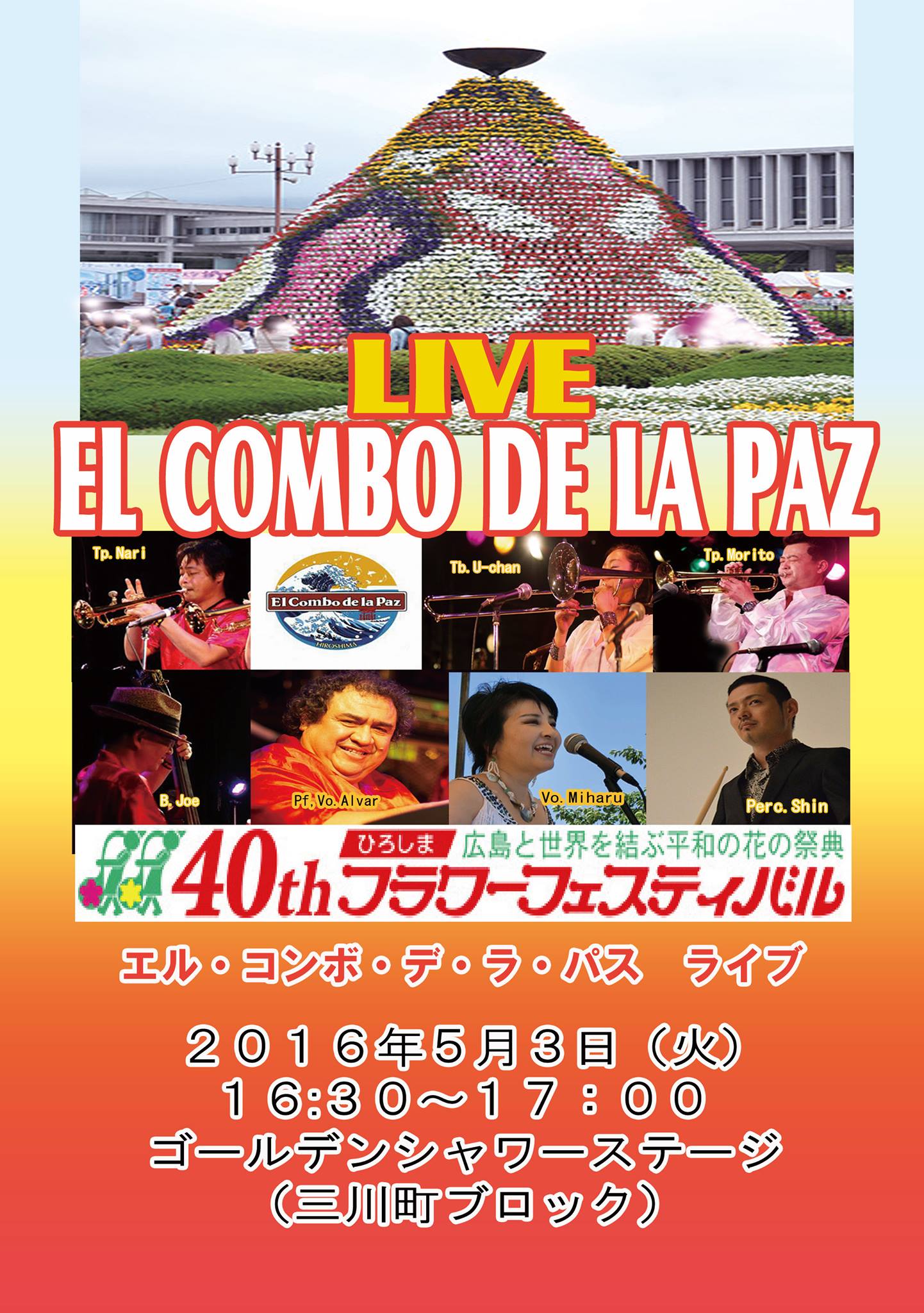 第40回フラワーフェスティバル (2016/05/03-05)今年もフラワーフェスティバルでサルサ・ラテンのステージやります。今年は8月にリオ・デ・ジャネイロでオリンピックが開催されます。それを記念してのサンバパレードが超注目です! ![]() 詳しくは、ホーザ・ジ・ヒロシマのサイトへ 【5月3日】 ★12:28-花の総合パレード ホーザ・ジ・ヒロシマ@流川→13:03平和公園 リオの強豪チーム、サウゲイロでトップダンサーを務め、「情熱大陸」にも登場した工藤めぐみさんをはじめ、神戸のフェジョン・プレットのダンサー・演奏者のみなさんも参戦。打楽器40人、ダンサー30人規模になる予定です。 ★13:45-グァナファト親善協会マリアッチ・コラレホライブ@カーネーションステージ(平和記念公園内) ★15:00-ホーザ・ジ・ヒロシマ@NHK広島放送局 ★15:45-グァナファト親善協会マリアッチ・コラレホライブ@コスモスステージ(Zoom-Zoom) ★16:30-El Combo de la Paz サルサライブ@ゴールデンシャワーステージ(FMチューピー)(三井ガーデンホテル道路向かい) ![]() 【5月4日】 ★11:30-ファシナシオン・ラティーナ/パフォーマンス@すみれステージ(ANAホテル道路向かい) ★12:40-ホーザ・ジ・ヒロシマ@NHK広島放送局 ★14;00-MACs/パフォーマンス@ラベンダーステージ(オリエンタルホテル近く) ★17:30-ホーザ・ジ・ヒロシマ@平和公園・カーネーションステージ ★17:15-グァナファト親善協会マリアッチ・コラレホライブ@オリーブステージ(RCC) 【5月5日】 ★15:45-グァナファト親善協会マリアッチ・コラレホライブ@コスモスステージ(Zoom-Zoom) ![]() ファシナシオン・ラティーナのパフォーマー4人組。 Tribute to Palladium Mambo legends. Cinco de Mayo Festivai マリアッチライブ(2016/05/03-04)