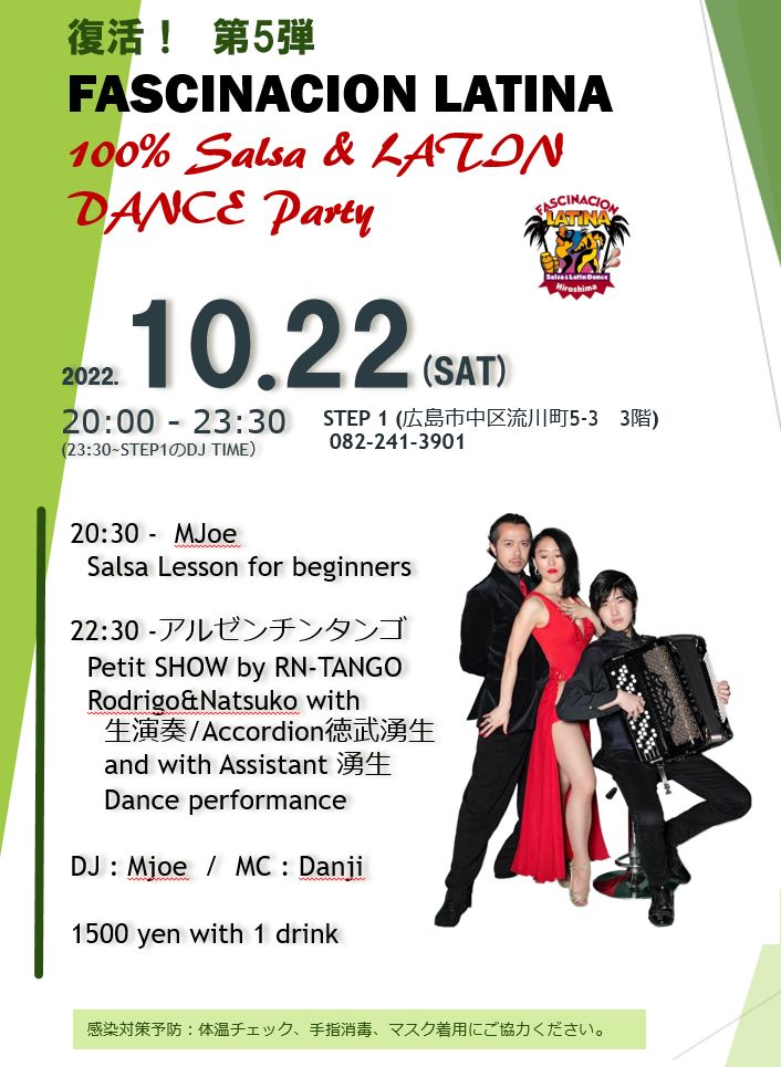 復活第5弾 100% Salsa & Latin Dance Party(2022年10月22日)の特別プログラム、ロドリゴ&ナツコタンゴショー「アルゼンチンタンゴプチSHOW by RNタンゴ」。 とても良かった!特にアコーディオン徳武湧生さん。22歳の若さでありながらしっかりと大人の雰囲気を醸し出してます。そのソロ生演奏(リベルタンゴ)とRodrigo&Natsuko with生演奏(ラ・クンパルシータ)、新しい形のライブを見せてくれました。タンゴの関係者のみなさんもたくさん来ていただきました。 パーティー自体も東京から出張で来られた方や久しぶりに広島に帰ってきたMamiさん、いつもの皆さんで盛り上がりました。 ダンスレッスンも楽しんでいただきました。 ![]() 【Rodrigo & Natsuko プロフィール】