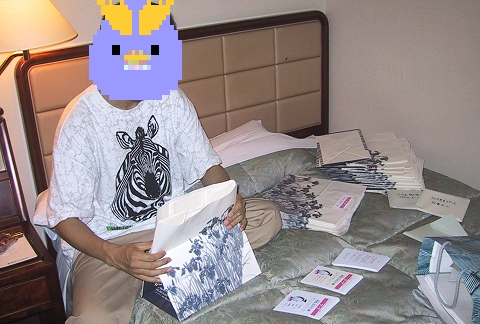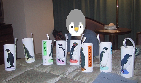 荷物の大半は会場にそのまま搬入するため、車に積んだままでOKだが、衣装のドレスだけは念のためホテルの部屋に移した。また、テーブルごとのペンギン画像や招待客の椅子に置く紙袋はまだ未セッティング状態だったので、この作業を、ホテルの部屋の中でおこなった。