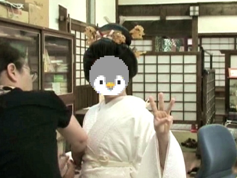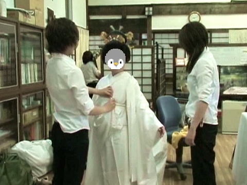 一通りの作業を終え、僕も控え室に移る。あでりーのメイクが始まっていた。最初は和装である。髪を上げて化粧を施し、頭に高島田のかつらをつける。アルタモーダさんのメイクは、華美になりすぎることなく上品にまとめられており、かつらもコンパクトで軽い。もともと美容師であるチーフプロデューサーのSさんをふくめ、女性スタッフが3人がかりでてきぱきと作業をこなしていく。仕事が素晴らしく速く、僕がビデオで撮影しているうち、あっという間に白無垢姿のあでりーができあがった。