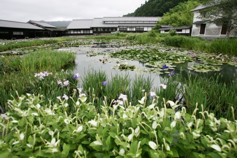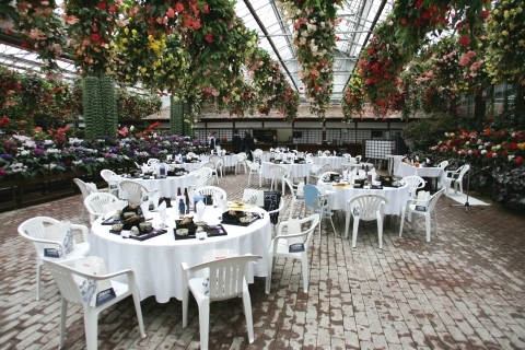 | 【会場の加茂花菖蒲園 正面が宴会場となる大温室、右手が受付会場の加茂荘】 |