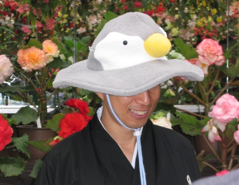 | 新婦中座のあと、僕はそのまま新郎席に残り、皆さんと話の続きを楽しんだ。名古屋港水族館に勤務されているKさんからペンギン帽子をいただいたので、それをかぶってポーズを決めたりしていた。 | |
