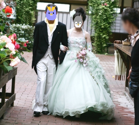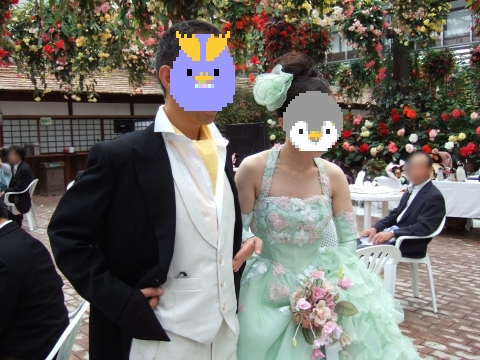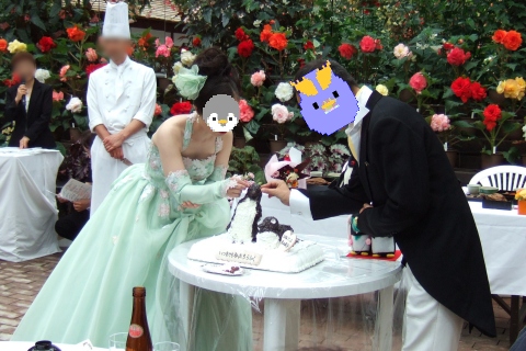 | (司会) 『お留守番のペンギンさんには、本日の本当の主人公お二人に、お席をお譲りいただきましょう。装いも新たに、お二人、メインテーブルにご到着でございます。どうぞみなさま、新たな祝福を、お二人にお贈り下さい』 | |