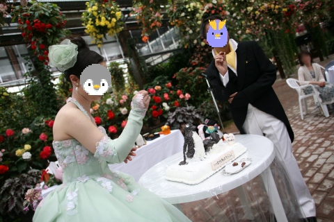 | (司会) 『ここでお二人は、ケーキセレモニーへと、お進みいただきます。今日はお二人に、ケーキにご入刀ではなく、別のかたちでこのケーキを完成させていただこうと思います。それでは、よろしくお願いいたします』 | |