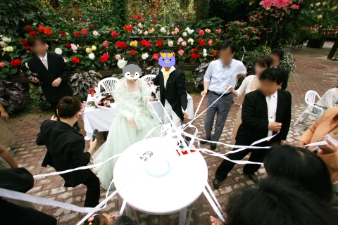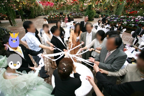 | テープは11本が束になり、司会者の方が真ん中あたりを手で握っている。その一端を11名の方に一本ずつ持っていただき、もう一方の端から2本を選んで、僕とあでりーが持つ。最後に司会者の方が握っている手を離すと、僕とあでりーが選んだのと同じリボンを選んで下さった方が残るしくみである。つまりは大きなくじ引きだ。みなさん、よくわからないながらも選んで下さる。あでりーの両親も遠慮がちにリボンをつかみ、またヤジが飛ぶ。 | |