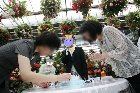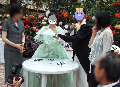| 司会者の方が、順に名前を読み上げる。呼ばれたほうはもうわかっているので、はにかんだ表情で聞いている。僕らのほうは、ああこの人が当ててくれたのか、という気持ちで発表を聞く。ここでなんと、あでりーの両親がそろって正解していることが判明し、あでりー側親類の方から、「出来レースじゃないか?!」との楽しいヤジが飛ぶ。 | |