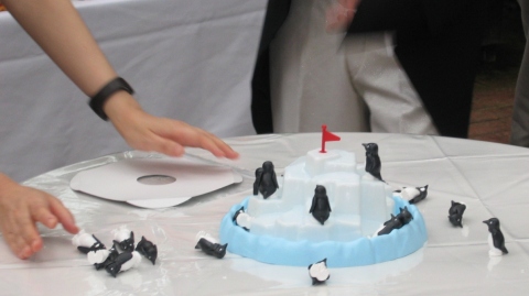 | お二人とも、意外にあっさりと大胆にペンギンを置いていく。まあこのゲームは、最初の10個くらいは簡単に置けるのだが、台に乗っているペンギンの数が多くなるにつれ、台の揺らぎも大きくなってくる。他の皆さんも熱心に見ていて下さるようで、台が揺れるたびに、「おお〜」という声がわき起こる。それでも、変わらずにお二人とも大胆に置いていく。 | |